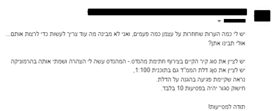 צילומי מסך מתוך דיונים בקבוצות אדריכליות מראים את הבקשות להסברים על הערות פקע"ר, וניתן לראות עד כמה התהליך עלול להיות מסובך ומייגע ללא הכוונה מקצועית: