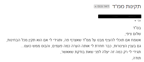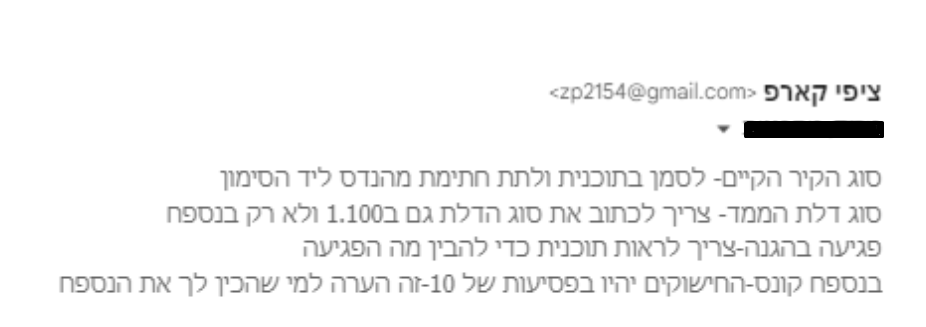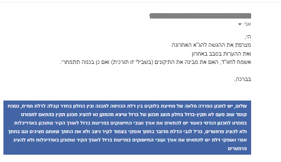 תיקים רבים מגיעים אליי רק לאחר שהאדריכלית ניסתה להתמודד לבד, קיבלה הערות, תיקנה, חיכתה שוב ושוב במשך שבועות, עד שהגיעה מיואשת. דוגמאות לכך אפשר לראות בהתכתבויות המצורפות.